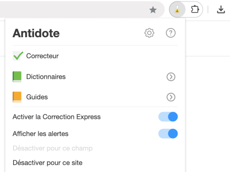 Vous souhaitez consulter un outil d’Antidote en particulier? Cliquez sur la fiole du Connecteur Antidote dans la barre d’outils du navigateur. En plus du correcteur, vous pourrez choisir lequel des dictionnaires ou des guides vous souhaitez ouvrir grâce à l’icône de dévoilement .