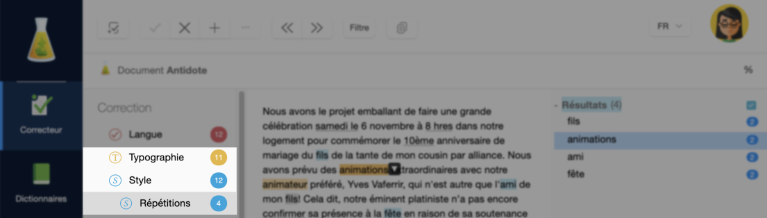 Passez en revue chacune des détections du correcteur. La liste des erreurs, des alertes et autres passages nécessitant votre attention s’affiche dans le panneau de droite. Cliquez sur un élément de cette liste ou directement sur le mot souligné dans le texte pour faire apparaitre l’infobulle et ses explications.