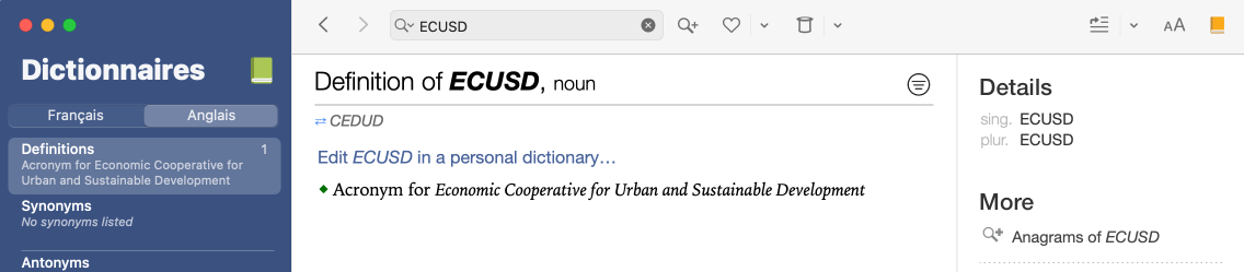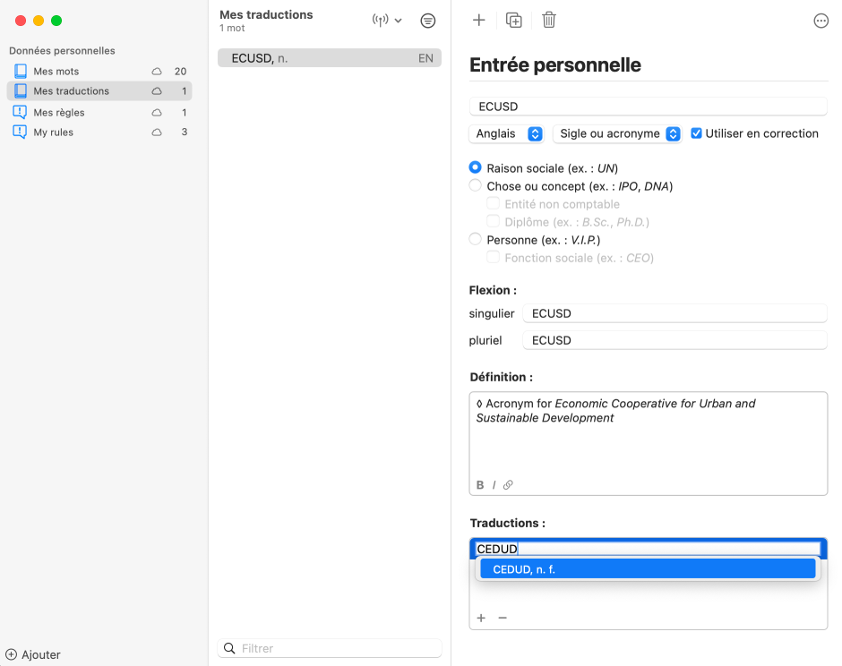 Ces informations apparaitront ensuite dans la fenêtre des dictionnaires comme toute autre entrée.