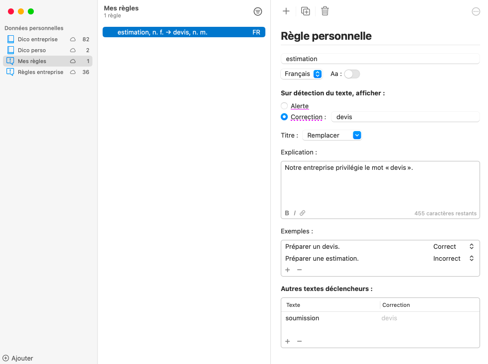 Voici une fonction particulièrement utile lorsque l’on écrit pour les autres : la possibilité de programmer des règles pour le correcteur. Certains de vos clients ont surement des préférences différentes des vôtres. Disons que vous traduisez habituellement quote par estimation, mais que votre client privilégie devis.
