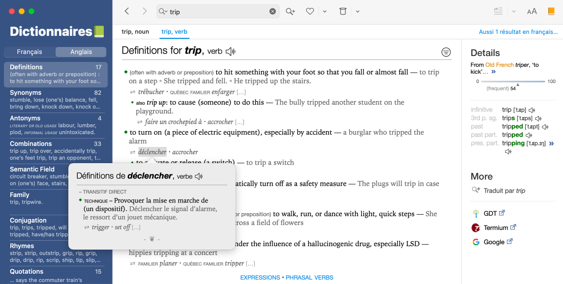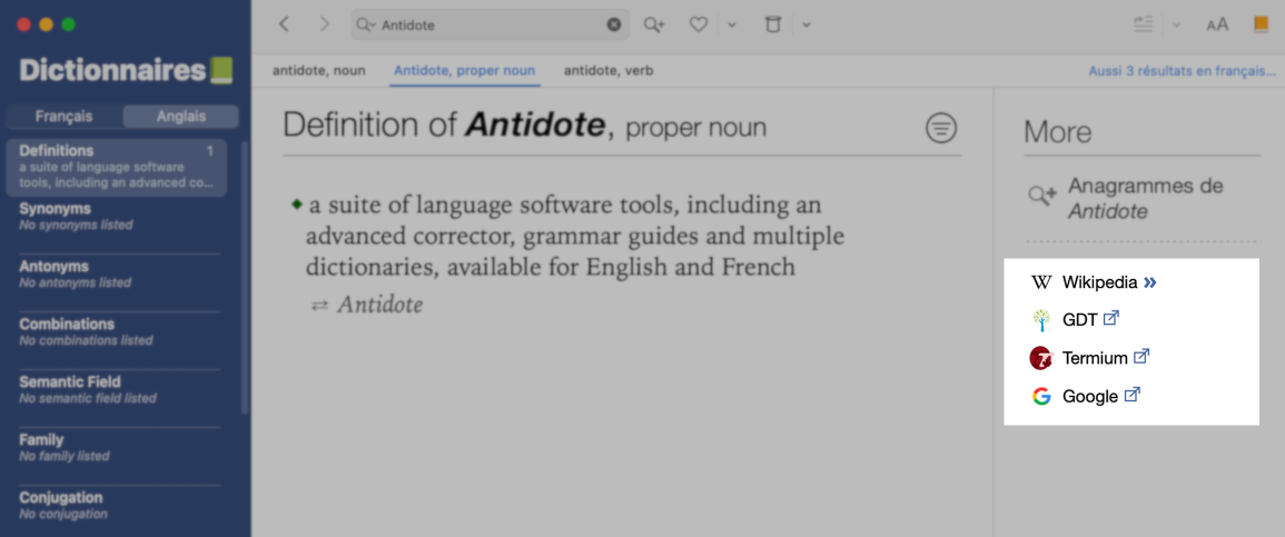 Pour vérifier si la traduction d’un mot est juste, rien de mieux que de comparer les deux définitions. Antidote vous permet de le faire dans la même fenêtre, sans changer d’ouvrage de référence.
