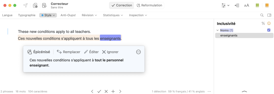 - Épicéniser — pour apporter des solutions inclusives aux doublets parfois lourds et vous assurer de ne pas oublier de masculin générique exclusif;