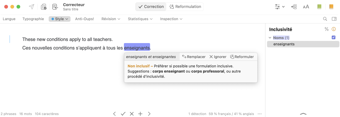 Assurez-vous de ne rien oublier avec le filtre Inclusivité du volet Style. Vous trouverez même des suggestions de remplacement dans l’infobulle, comme un doublet ou un nom collectif. Ou cliquez sur le titre orangé (Non inclusif dans l’exemple) pour ouvrir les guides, qui présentent divers procédés pour rendre vos textes plus inclusifs.