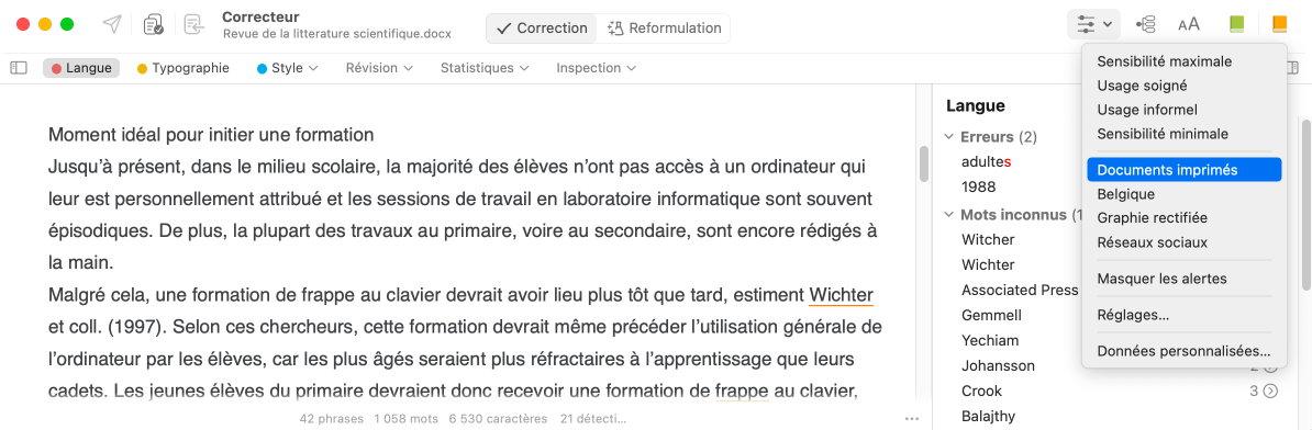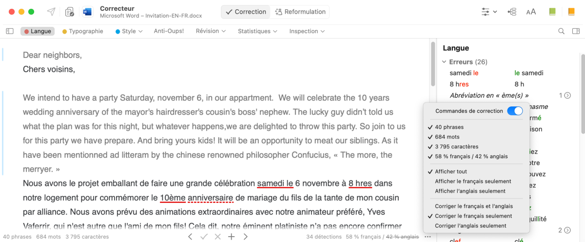 Si vous travaillez dans un document multilingue, le correcteur vous permet d’afficher et de corriger seulement le français ou l’anglais.