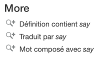 Par exemple, dans l’entrée du verbe anglais say, le verbe français dire figure dans presque tous les sens et sous-sens; alors que le résultat de la recherche des mots traduits par say dresse une liste de mots sans répétitions, exposant plus de choix au premier coup d’œil. Vous y trouverez peut-être plus facilement l’inspiration!