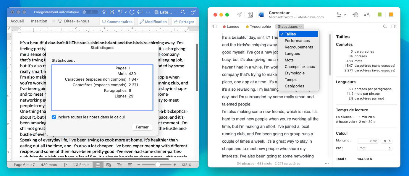 Utilisez le filtre Tailles du volet Statistiques pour compter le nombre de mots. Puisque le correcteur analyse le texte, il est en mesure de reconnaitre les mots élidés et de les dénombrer, ce que d’autres logiciels ne font pas. Par exemple, Microsoft Word ne compte qu’un mot pour « it’s » ou « j’aime ». Dans l’exemple ci-dessous, la différence dépasse les 50 mots!