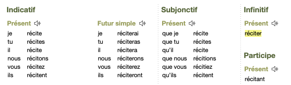 Vous trouverez aussi des prononciations audios particulières aux dictionnaires de conjugaison et de rimes. Dans le premier, Antidote récite un temps simple complet en un clic (ex. : je récite, tu récites, il récite, nous récitons, vous récitez, ils récitent).