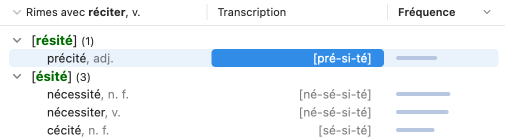Et dans le dictionnaire de rimes, en cliquant sur la transcription phonétique d’un résultat, vous entendrez d’abord la prononciation du mot en vedette suivie du résultat, pour bien saisir l’effet sonore que les deux produisent ensemble (ex. : réciter, précité).