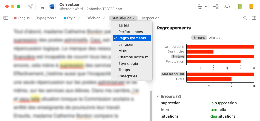 Le filtre Regroupements (sous Statistiques) peut vous aider à identifier les fautes que vous êtes le plus susceptible de commettre. Cliquez sur une catégorie pour en voir le détail en sous-groupes, avec la liste des détections.