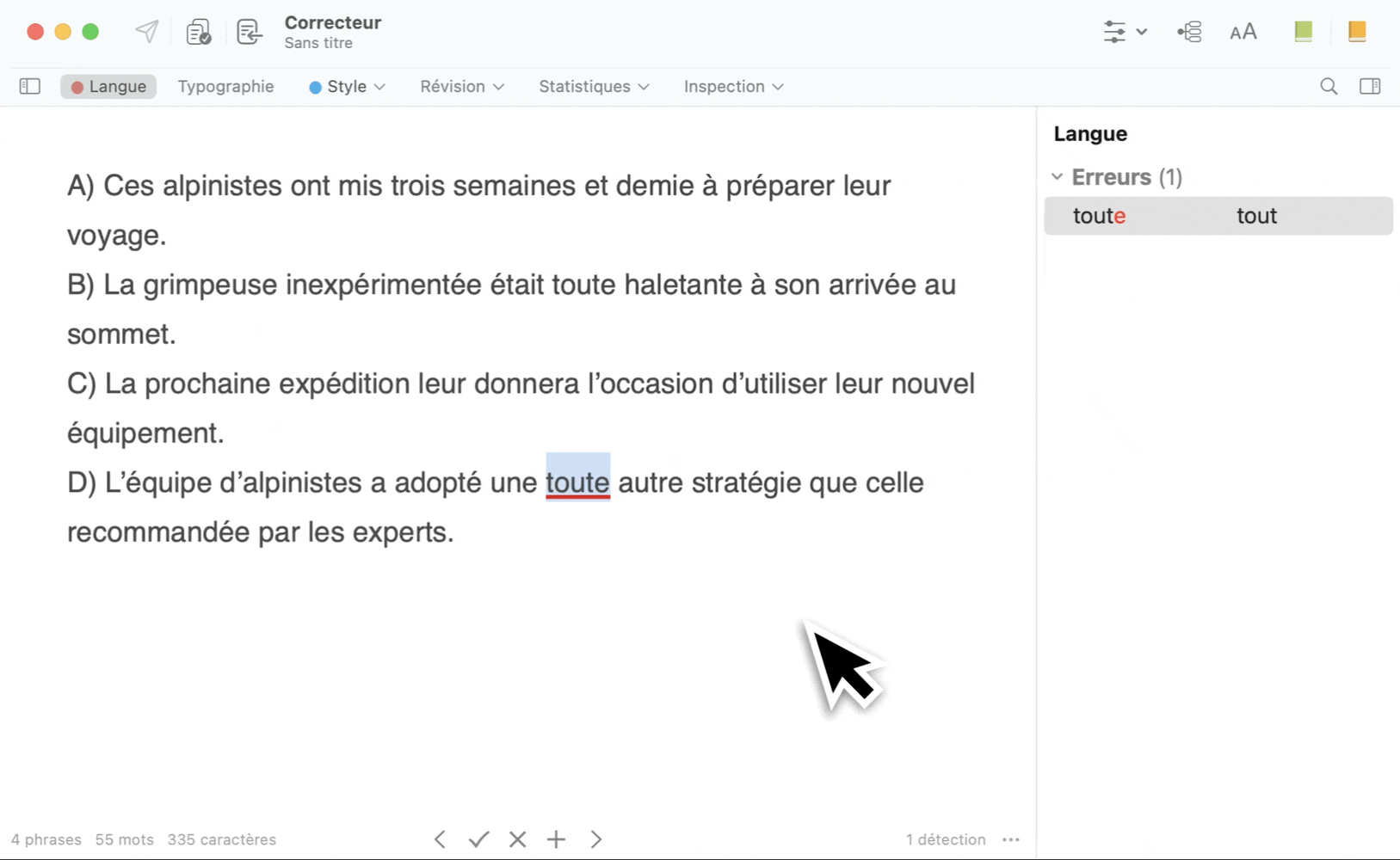 Après quelques exercices, vous serez en mesure d’établir une méthode de révision qui vous est propre. Vous augmentez ainsi vos chances d’attraper toutes les fautes!