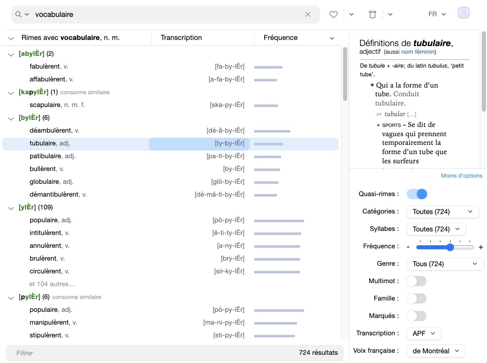 Attention : l’accent peut influencer la rime! Assurez-vous de choisir la voix en conséquence dans le panneau des options, entre Montréal et Paris.