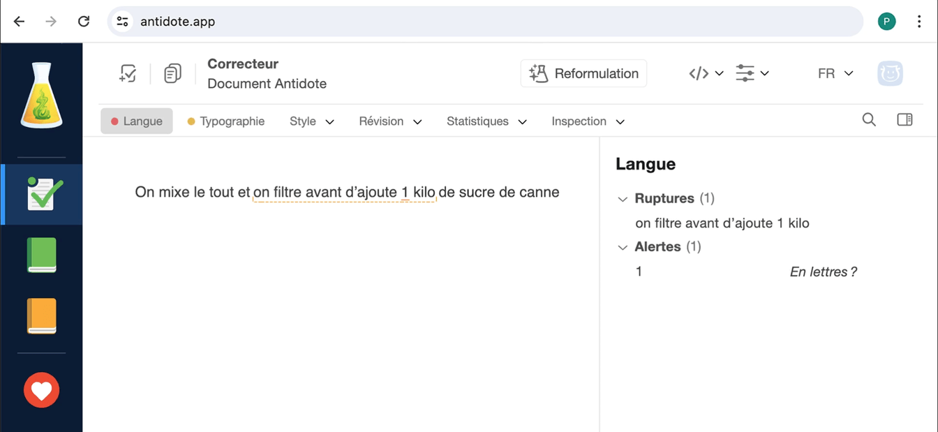 MP : Pour vous donner un exemple concret dans Antidote, vous pouvez maintenant utiliser la reformulation pour résoudre un signalement de rupture — ces passages que notre correcteur souligne par un trait orangé pointillé pour indiquer là où son analyse bute.
