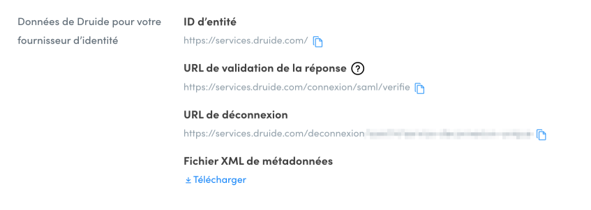 Cette section présente les informations à utiliser dans la configuration SAML du fournisseur d’identité. Ces liens ne peuvent pas être édités, seulement copiés (en cliquant sur ). Vous pouvez aussi télécharger le fichier XML de métadonnées pour une configuration automatique.