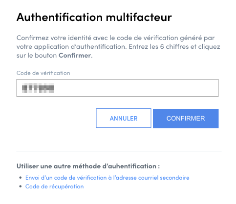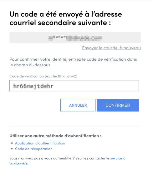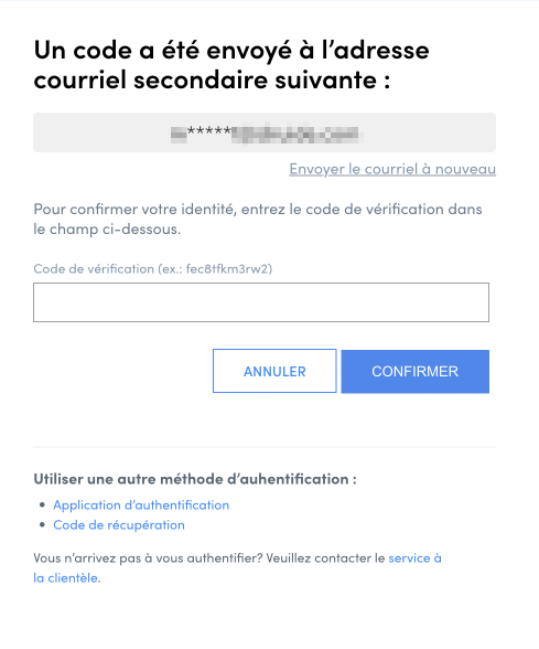 Si vous utilisez une application d’authentification et éprouvez un problème avec vos codes de récupération, ou n’en avez pas, vous pouvez demander à recevoir un code de vérification à votre adresse courriel secondaire si vous en avez préalablement défini une.