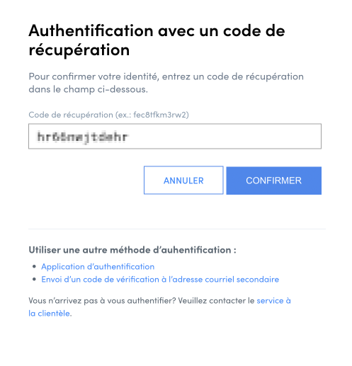 Saisissez l’un de vos codes de récupération dans le champ correspondant.
