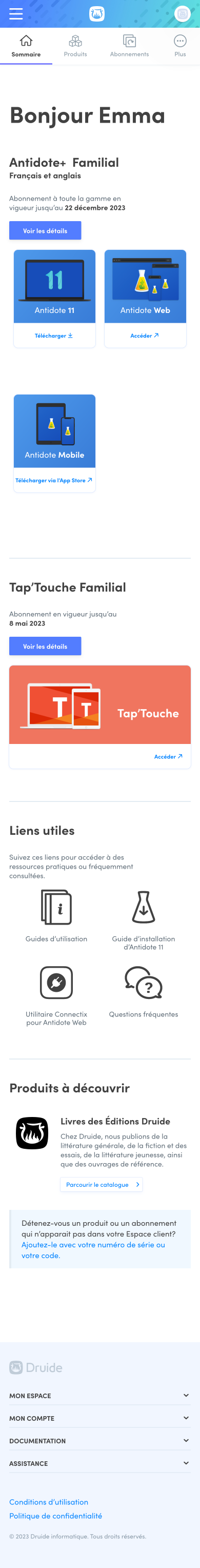 La section Produits à découvrir vous permet de découvrir les livres publiés par les Éditions Druide, grâce au bouton Parcourir le catalogue.