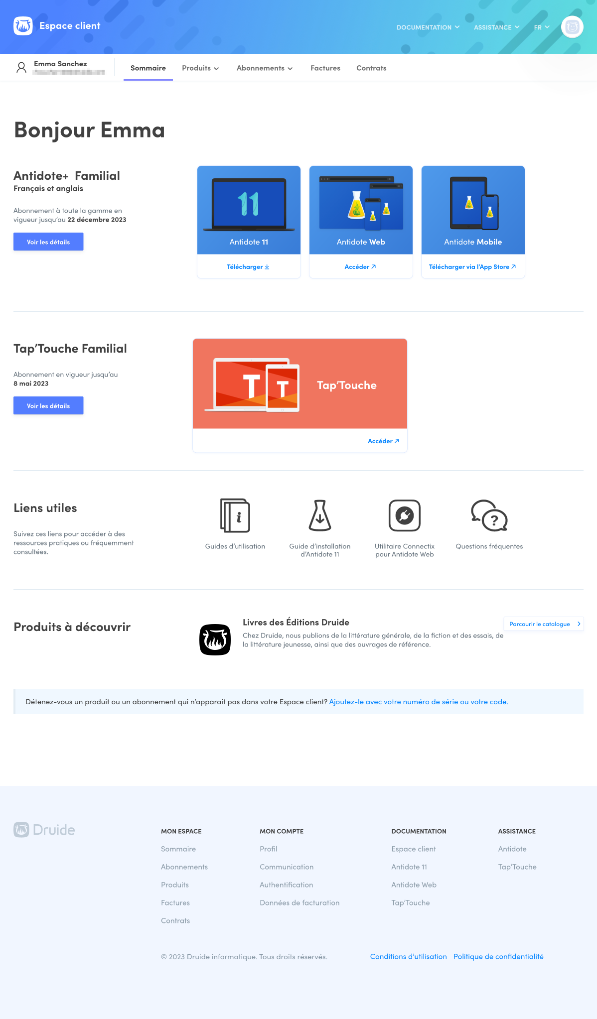 L’Espace client vous accueille avec le contenu de l’onglet Sommaire. Vous y trouverez diverses sections en lien avec vos abonnements et vos produits.