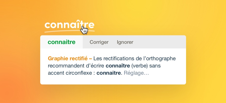 Le correcteur reconnait les graphies rectifiées, et, selon le réglage des rectifications, peut les accepter ou les signaler comme erreurs. Il traite aussi bien les modifications lexicales (voir les exemples plus haut) que syntaxiques (les traits d’union entre les numéraux et l’invariabilité de laissé devant un infinitif).
