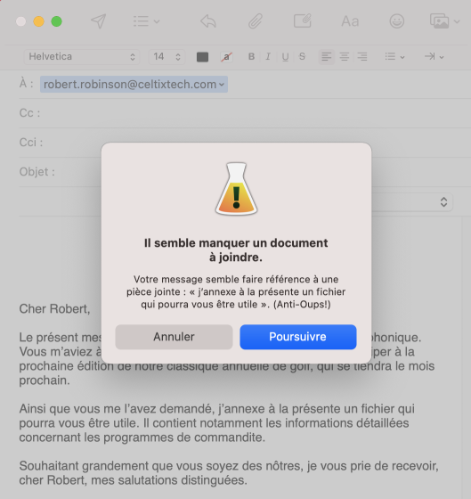 Lorsque vous appuyez sur Envoyer, l’Anti-Oups! vérifie que vous n’avez pas oublié de joindre un document. Si aucun document n’est joint à votre message, l’Anti-Oups! fait analyser le texte du message par Antidote ; si un passage mentionne un document à joindre, l’Anti-Oups! vous alerte en ouvrant une fenêtre directement dans votre logiciel de courriel. Vous pouvez alors annuler l’envoi et joindre la pièce manquante, ou poursuivre tout simplement l’envoi.