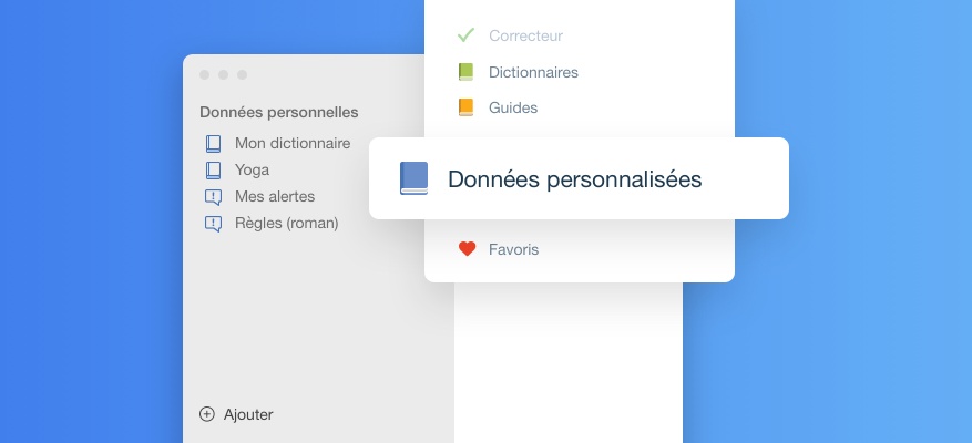 Les données personnalisées sont les informations que vous ajoutez à Antidote, votre « contribution personnelle » à ses dictionnaires et à sa correction. Le processus d’ajout est conçu pour que vos données s’intègrent parfaitement à celles d’Antidote, tout en leur conservant une marque distinctive, notamment par la couleur. La définition donnée à votre nouveau mot s’affichera comme toutes les autres aux dictionnaires ; les règles que vous élaborerez auront leur infobulle complète, comme s’il s’agissait d’une détection native d’Antidote. Grâce aux données personnalisées, Antidote apprend à mieux vous connaitre et à mieux vous servir.