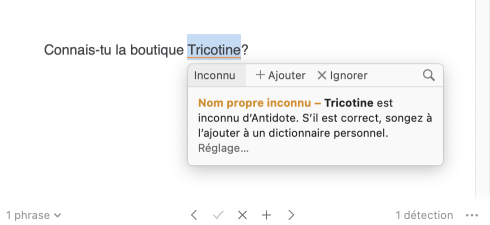 - L’option d’ajout aux dictionnaires personnels est également offerte au menu Détection d’Antidote ainsi que dans le menu contextuel (clic droit) lorsqu’une détection est sélectionnée dans le texte ou dans la liste des détections. L’ajout peut enfin s’effectuer à partir de la commande dans la barre d’état au bas de la fenêtre du correcteur.
