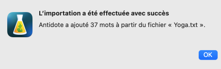 Une fenêtre fournit des indications sur le résultat de l’importation. Antidote indique entre autres le nombre de mots qui ont été ajoutés, modifiés et rejetés.
