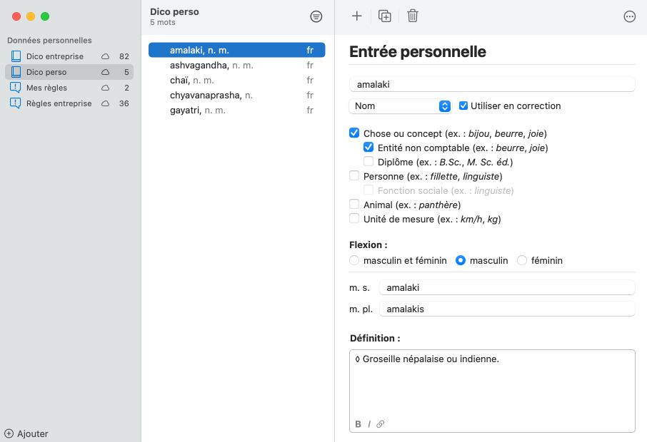 Les données personnalisées sont les informations que vous ajoutez à Antidote, votre « contribution personnelle » à ses dictionnaires et à sa correction. Le processus d’ajout est conçu pour que vos données s’intègrent parfaitement à celles d’Antidote, tout en leur conservant une marque distinctive, notamment par la couleur. La définition donnée à votre nouveau mot s’affichera comme toutes les autres aux dictionnaires ; les règles que vous élaborerez auront leur infobulle complète, comme s’il s’agissait d’une détection native d’Antidote. Grâce aux données personnalisées, Antidote apprend à mieux vous connaitre et à mieux vous servir.