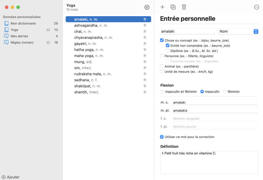 Les données personnalisées sont les informations que vous ajoutez à Antidote, votre « contribution personnelle » à ses dictionnaires et à sa correction. Le processus d’ajout est conçu pour que vos données s’intègrent parfaitement à celles d’Antidote, tout en leur conservant une marque distinctive, notamment par la couleur. La définition donnée à votre nouveau mot s’affichera comme toutes les autres aux dictionnaires ; les règles que vous élaborerez auront leur infobulle complète, comme s’il s’agissait d’une détection native d’Antidote. Grâce aux données personnalisées, Antidote apprend à mieux vous connaitre et à mieux vous servir.