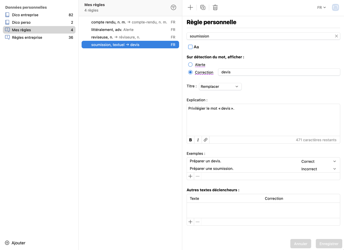 Une règle est composée d’un déclencheur, d’un type de détection, d’un mot de remplacement optionnel, d’une explication. Une règle génère une détection qui peut être une alerte ou une correction. En complément, illustrez la règle par des exemples d’utilisation corrects et incorrects. Ou encore ajoutez pour une même règle d’autres déclencheurs semblables, qui peuvent déclencher des corrections différentes.