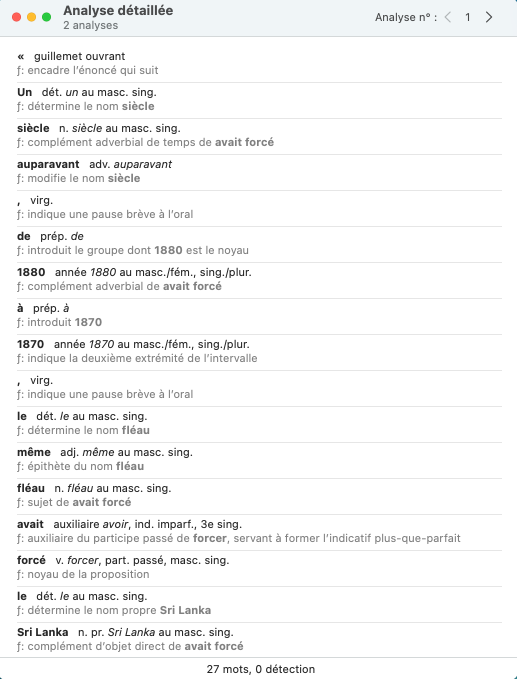 Pour effectuer son travail, le mode Correction fait l’analyse détaillée de chaque phrase. Pour évaluer ses diagnostics, ou simplement pour satisfaire votre curiosité linguistique, vous pouvez consulter le résultat de cette analyse de deux manières.