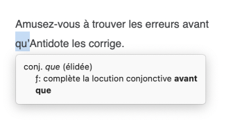 Directement depuis le panneau principal du correcteur, la bulle Nature et fonction présente une description de la nature et de la fonction de chaque élément de la phrase (mot, locution, ponctuation, etc.). Pour faire afficher cette bulle, choisissez Nature et fonction dans le menu contextuel (clic droit).