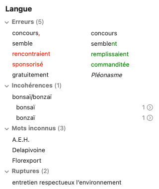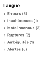 Dans le volet Langue, les classes de détections sont : Erreurs, Incohérences, Mots inconnus, Ruptures, Ambigüités et Alertes. Ces classes respectent un ordre de priorité, soit des détections les plus graves (erreurs) aux vérifications pointues (alertes).