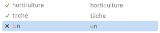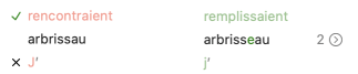 Ambigüités — Les ambigüités sont suivies du menu des graphies possibles : cliquez sur les deux petits chevrons à droite pour sélectionner celle qui convient au contexte.