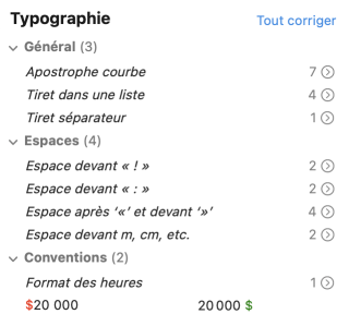 Les détections typographiques sont très uniformes et ne demandent pas de réflexion profonde. Le même espacement s’applique, par exemple, devant tous les points-virgules du texte. Le correcteur opte pour une présentation générique plutôt que spécifique ; ainsi, les détections typographiques de même contexte sont regroupées sous un seul titre générique, affiché en italique : Tiret dans une liste, Espace devant « ; », etc. Cliquez sur le bouton Tout corriger au-dessus de la liste des résultats pour corriger en lot toutes les détections de la liste, ou doublecliquez sur un titre générique pour corriger en lot le sous-ensemble concerné.