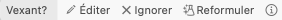 La commande Reformuler vous suggère des versions plus douces et mesurées des passages potentiellement vexants. Cliquez-la pour les découvrir. L’infobulle de reformulation se présente dans une interface distincte et vous offre tout ce dont vous avez besoin pour procéder à la reformulation complète ou partielle de la phrase. Voyez la page Traitement d’une reformulation pour en connaitre et en exploiter les diverses composantes.
