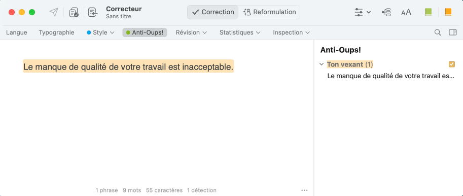 Antidote est ici à l’affut des propos qui pourraient heurter autrui dans une correspondance personnelle. Outre les mots, les signes de ponctuation et le format peuvent à eux seuls véhiculer une certaine charge émotive qu’on voudra peut-être estomper. Soyez sans crainte : les points d’exclamation plus nombreux qu’il ne le faudrait, les majuscules « criardes », certains émojis et autres éléments formels en apparence anodins, mais potentiellement délicats, n’échapperont pas à la vigilance d’Antidote. Dans tous les cas, bien sûr, c’est à vous de juger de la meilleure façon de transmettre votre message.
