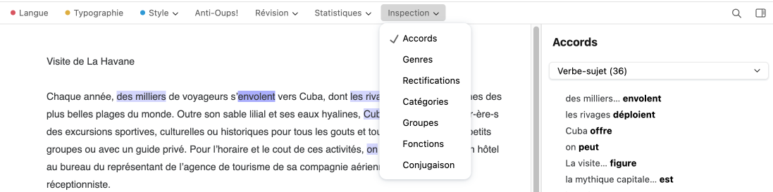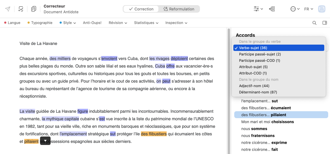 Les filtres d’accords sont idéaux pour approfondir ses connaissances à partir de ses propres écrits. Un code de couleurs facilite le repérage du donneur et du receveur d’accord. Pour une meilleure intégration du concept d’analyse, Antidote affiche séparément les accords ayant lieu dans le groupe du verbe et ceux ayant lieu dans le groupe du nom.