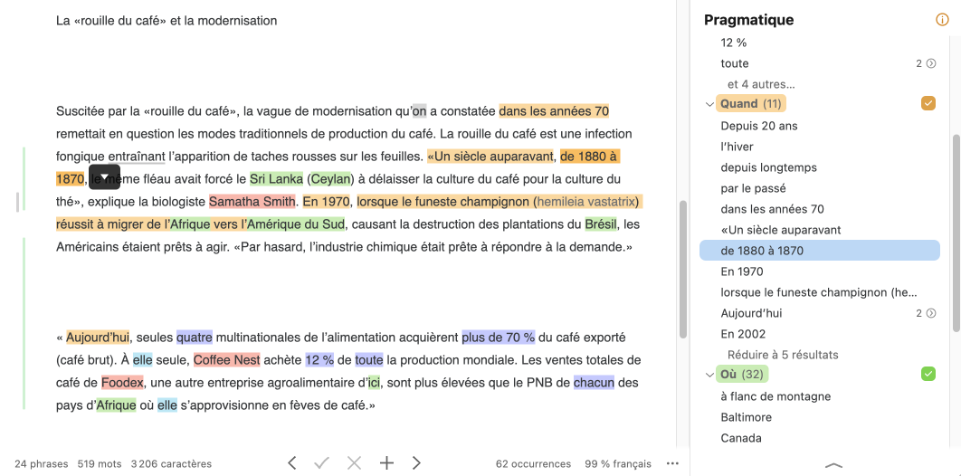 Dans l’exemple ci-dessous, le texte est vu à travers le filtre Quand (Pragmatique). D’un simple coup d’œil, vous pouvez relever un problème (par exemple, l’expression temporelle de 1880 à 1870 est pour le moins suspecte ; on imagine facilement que le rédacteur voulait plutôt écrire de 1870 à 1880).