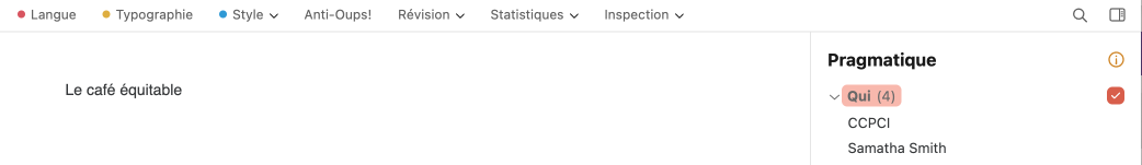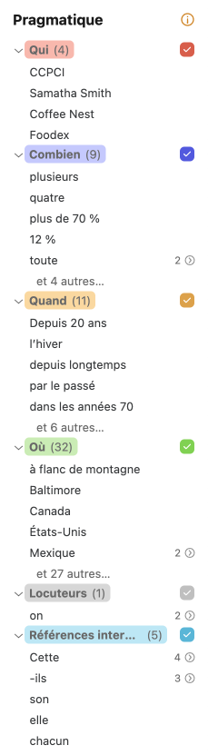 Le filtre pragmatique Qui révèle les noms de personnes ou d’entités personnalisées. On peut ainsi identifier d’un coup d’œil les acteurs du texte et jauger leur distribution.