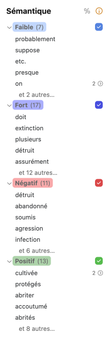 - Un curseur dans le panneau des options permet le traitement prioritaire des mots de sens faible, fort, négatif ou positif dans tous leurs emplois ; à la sensibilité maximale, les résultats incluront aussi des mots de sens faible, fort, négatif ou positif dans certains de leurs emplois seulement.