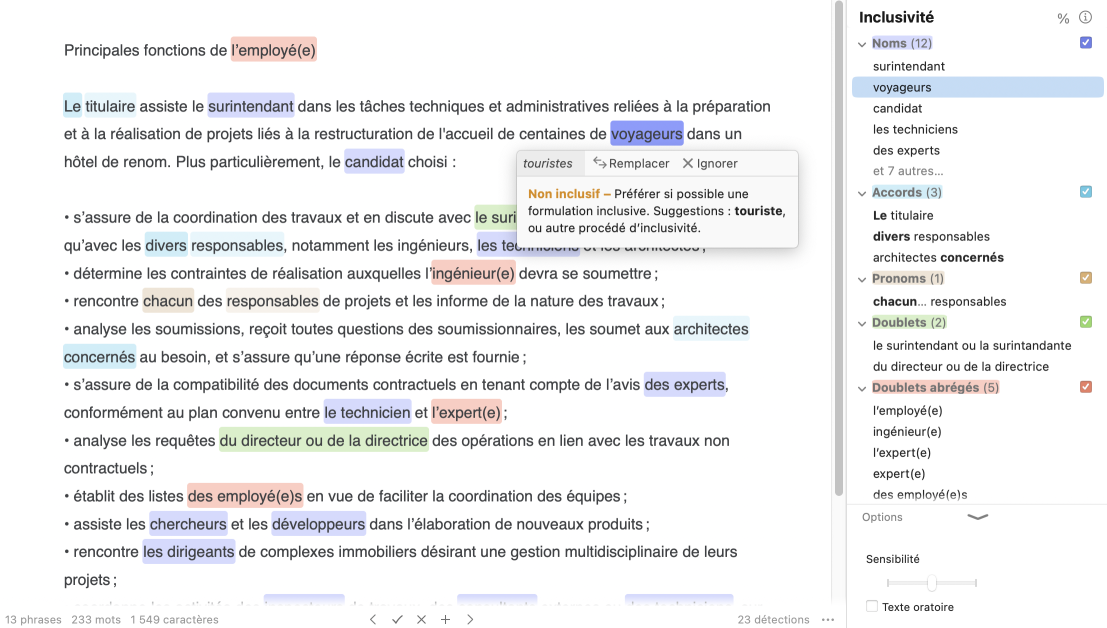 Pour une vérification plus uniforme, Antidote regroupe les noms de genre non inclusif (un client ; une infirmière), les noms originalement épicènes qu’un accord rend non inclusifs (la responsable ; les ministres élus ; nous en sommes ravis) et les pronoms non inclusifs (il ; quelques-unes). Voyez l’infobulle associée à chaque détection pour des suggestions de remplacements ; par exemple, l’expression non inclusive certains des linguistes peut être remplacée par l’expression épicène quelques linguistes.
