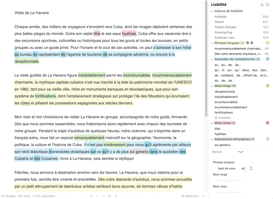 La lisibilité d’un texte est considérée comme optimale quand sa lecture est fluide et que son contenu est facilement compris du lectorat visé. Elle se mesure à partir de divers éléments textuels, notamment la longueur des mots et des phrases, ainsi que l’accessibilité du vocabulaire employé. Antidote liste pour vous les éléments du texte qui pourraient nuire à sa lisibilité, que vous voudrez probablement examiner de plus près.