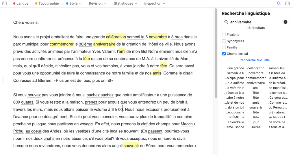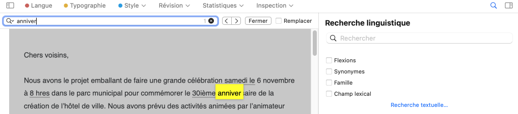 Pour Antidote 11, la Recherche linguistique a été réinventée. Cliquez sur la loupe dans la barre de navigation. Entrez un mot (ou une chaine quelconque) dans la zone de recherche, et la Recherche linguistique en indique toutes les occurrences dans le texte. En particulier, l’option Flexions vous révèle toutes les formes d’un mot (ouvrir, ouvrira, ouvert, etc.). Grâce aux options Synonymes, Famille et Champ lexical, explorez les écrits comme vous ne l’avez jamais fait auparavant. Le réseau sémantique du texte, qui en tisse la connotation et révèle toute sa profondeur, se dessine devant vos yeux. Naviguez sur les résultats directement dans le texte ou retrouvez-en la liste complète, sous les options dans le panneau de droite.