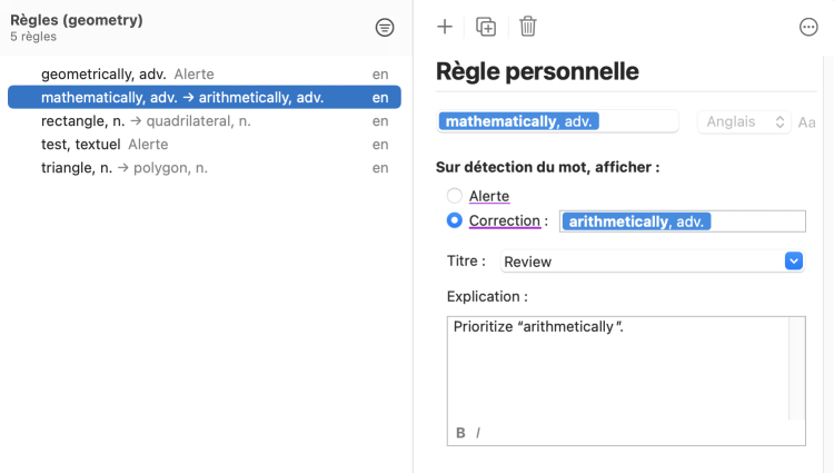 L’ajout d’une règle spécifiquement anglaise dans les règles personnelles se fait de la même façon qu’en français, en saisissant la forme canonique (le singulier pour un nom ou un adjectif, l’infinitif pour le verbe) du déclencheur dans la zone Rechercher un mot à signaler. Une liste de suggestions s’affiche. Si elle est en français, sélectionnez Afficher les résultats anglais au bas de la liste pour voir les suggestions anglaises.