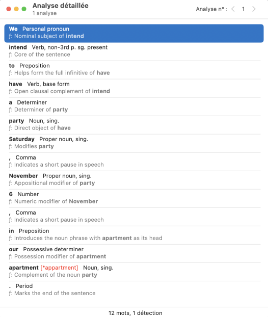 L’analyse détaillée est également offerte pour les phrases anglaises, à cette différence près qu’elle utilise des notions d’analyse grammaticale anglaise (ex. : core, modifier, clause, utterance, copula, etc.). Pour une définition linguistique claire (en anglais) de ces termes, on peut consulter les dictionnaires d’Antidote.