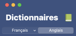 Les dictionnaires anglais d’Antidote sont automatiquement appelés lorsqu’on tape un mot anglais non ambigu dans la vedette. Atteignez-les également depuis n’importe quel dictionnaire français par le bouton Anglais (au-dessus de la liste des dictionnaires), et passez ainsi d’une entrée française à sa traduction anglaise. Si plusieurs traductions sont possibles, un chevron à droite du bouton Anglais apparait. Cliquez sur ce chevron pour choisir l’entrée à afficher. Par défaut, la traduction choisie sera la plus fréquente.