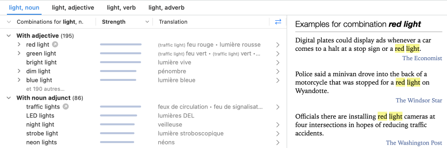 Pour l’entrée nominale light, « lumière », on trouvera donc des cooccurrences comme (give the) green light, (stop at) traffic lights, light of day, the lights go out, ray of light, beam of light, light years, light pollution et des centaines d’autres. Certaines cooccurrences sont aussi des locutions qui possèdent elles-mêmes des cooccurrences. Pour consulter les cooccurrences d’une locution, appuyez sur le bouton de mise en vedette ().