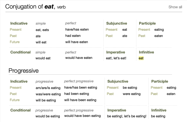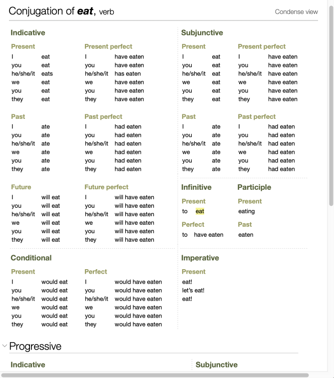 Pour chaque verbe, le dictionnaire affiche les formes des six modes et dix-sept temps de la conjugaison anglaise, distinguées en formes non progressives (par exemple, I eat) et progressives (I am eating). La forme saisie en vedette est surlignée pour aider au repérage. Le sous-titre Progressive, qui introduit les formes progressives du verbe, dispose, en mode d’affichage complet (Show all), d’un chevron de dévoilement qui permet de masquer cette partie du dictionnaire.