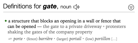 Contextes d’emploi — Une traduction peut être précédée d’une mention qui précise son contexte d’emploi. Ces contextes figurent entre parenthèses et en caractères romains. Par exemple, sous la première définition du nom anglais gate, qui est assez générique, on peut voir que certaines traductions valent pour des contextes plus circonscrits selon la fonction ou la forme de cet objet.
