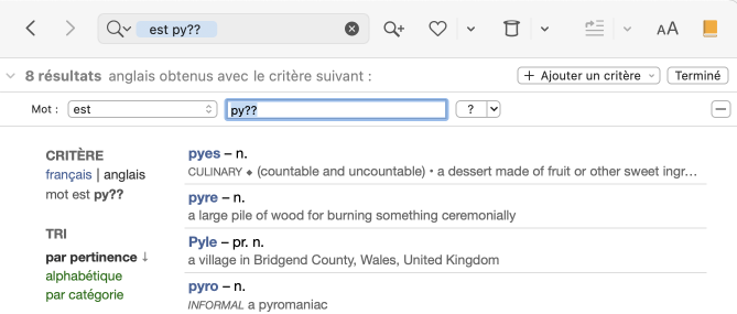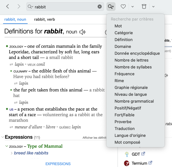 - des recherches par critères prédéfinies (définition contient, traduit par, anagrammes, mot composé avec);